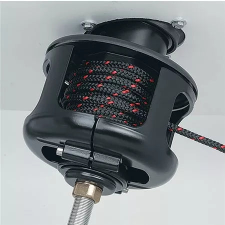Ball bearings between center hub and deck bearing, and main shaft reduce friction; drum and halyard swivel turn freely under load.