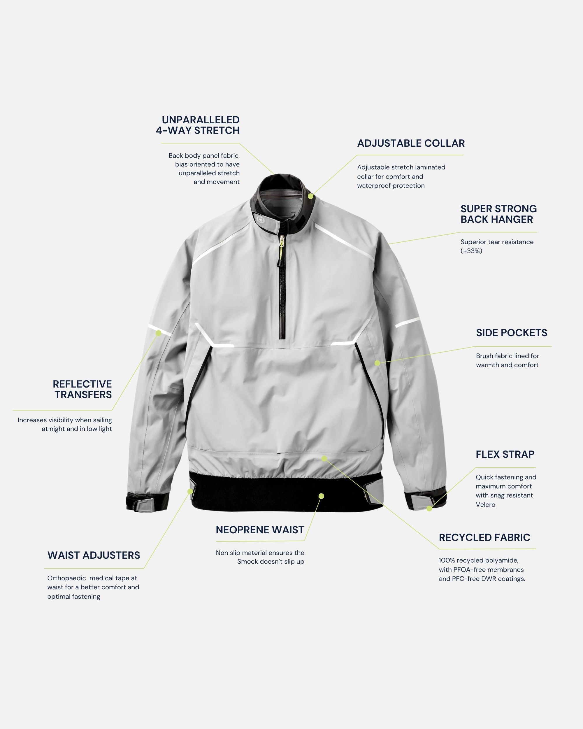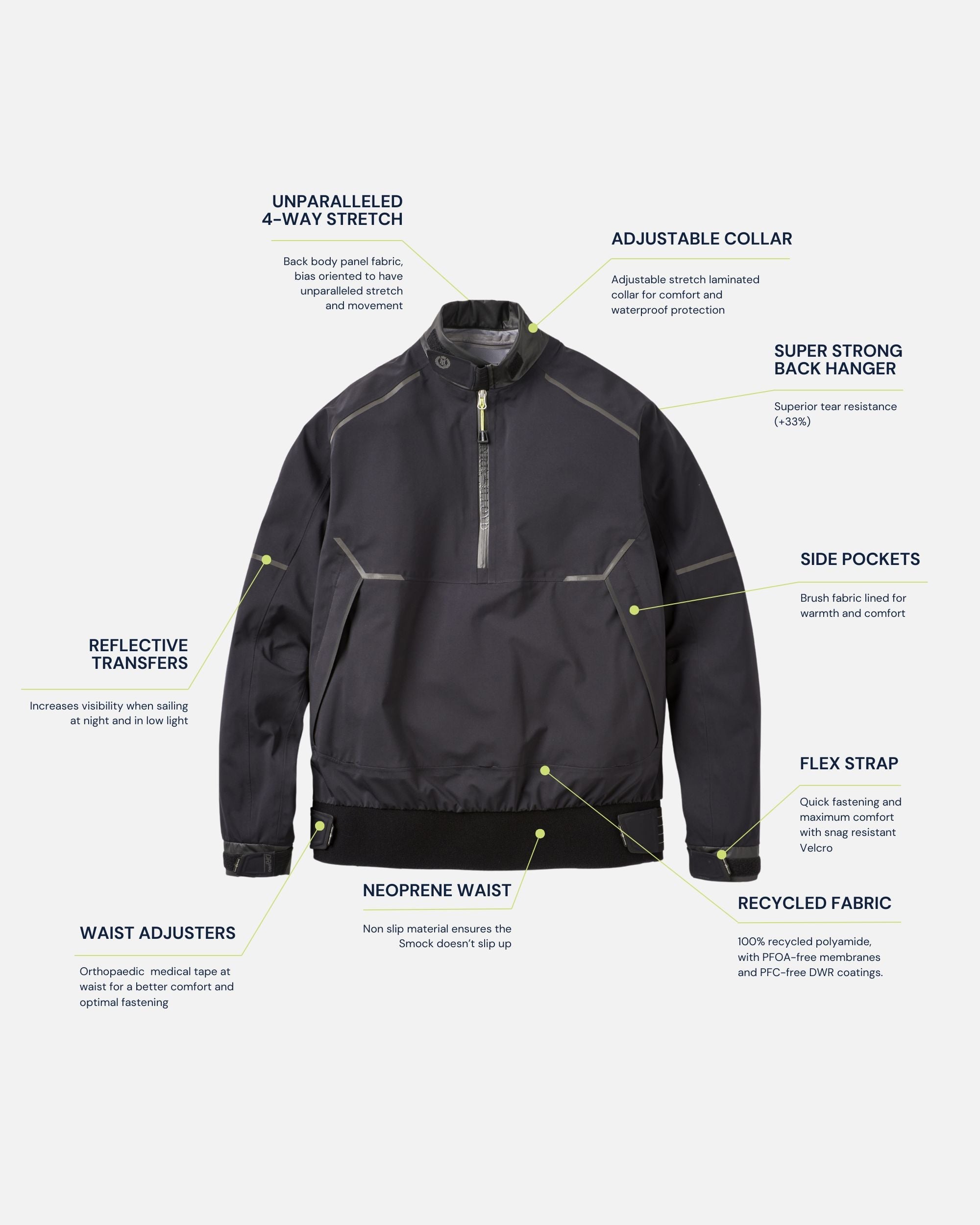 Engineered from over six decades of technical expertise and innovation, Henri-Lloyd’s Dynamic Smock features our exclusive 3-Layer DRI PRO lightweight stretch waterproof recycled fabric, articulated sleeves, neoprene hem, and YKK® Aquaguard® zip, delivering unmatched freedom of movement, comfort, and waterproof protection for sailors who demand peak performance in extreme conditions.